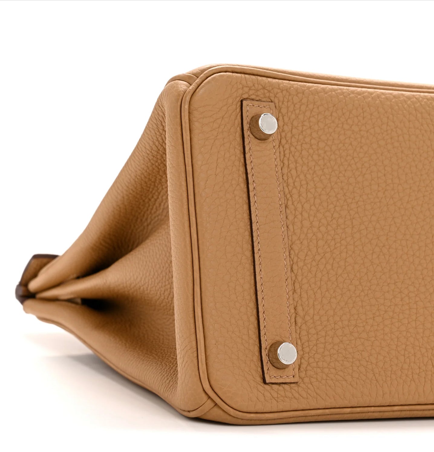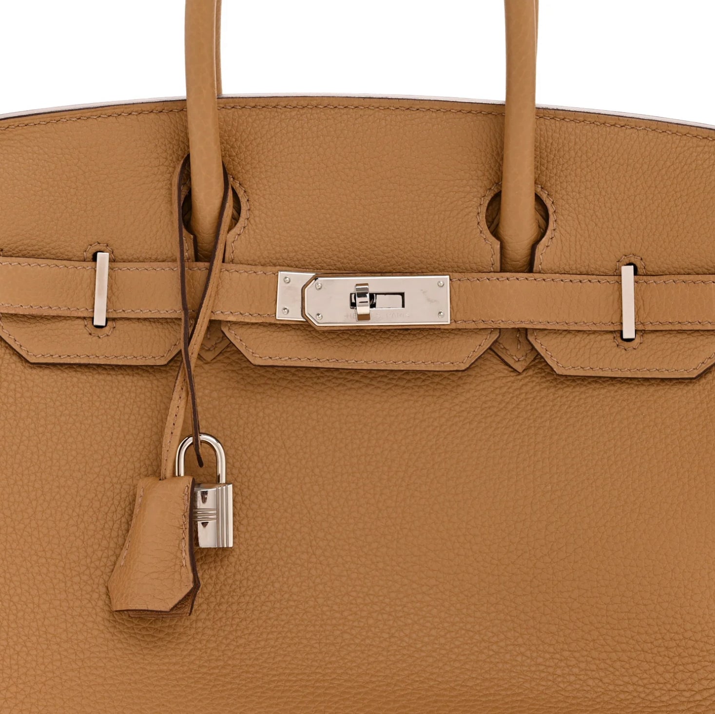 Dit is een authentieke HERMES Togo Birkin 30 in de kleur Biscuit. Deze ultrachique klassieke handtas is vervaardigd van luxueus Togo-leer in een lichtbruine kleur. De tas heeft dunne maar stevige, opgerolde leren handvatten, een overslagklep met een riemsluiting en sluitingen met een palladium vergulde draaisluiting. De bovenkant opent naar een ruim interieur van lichtbruin leer met een ritsvak en steekvakken.
