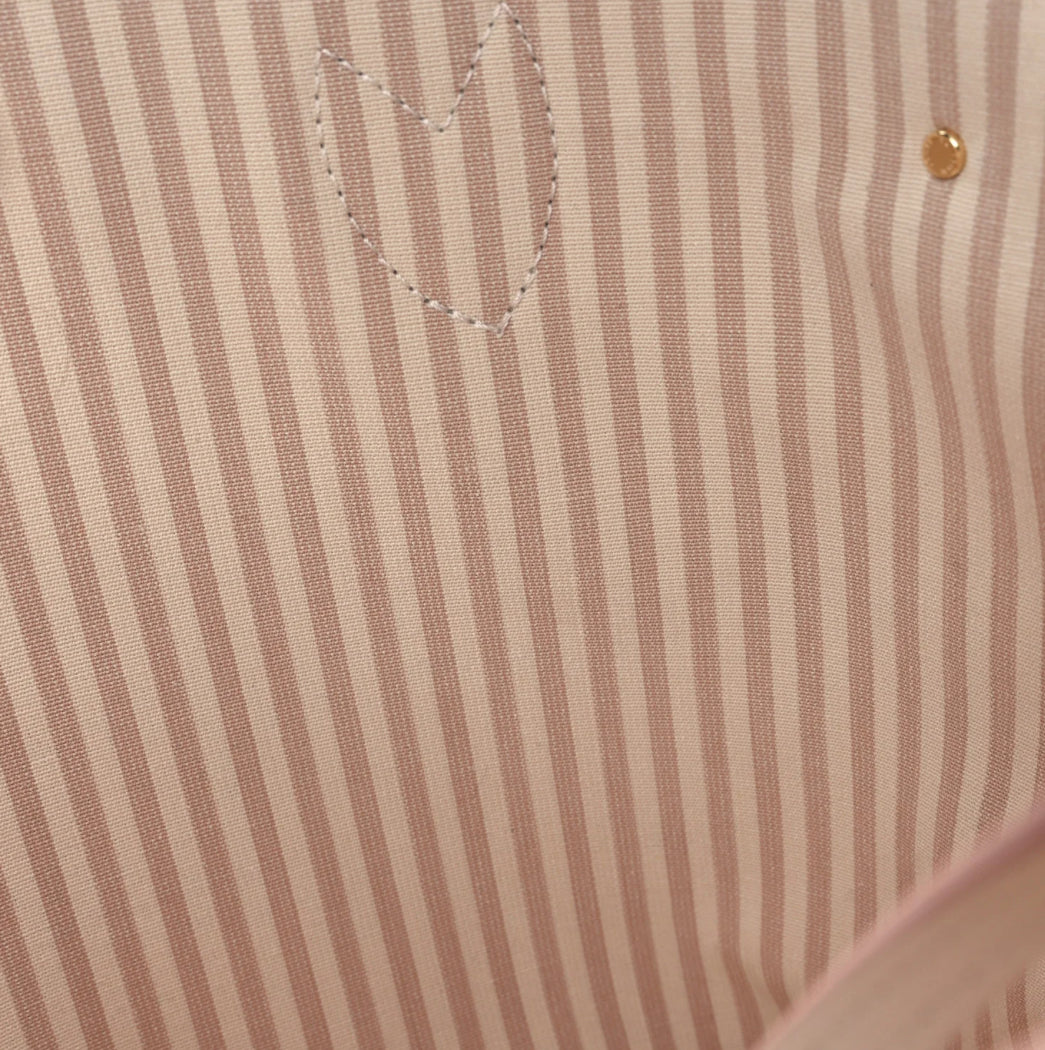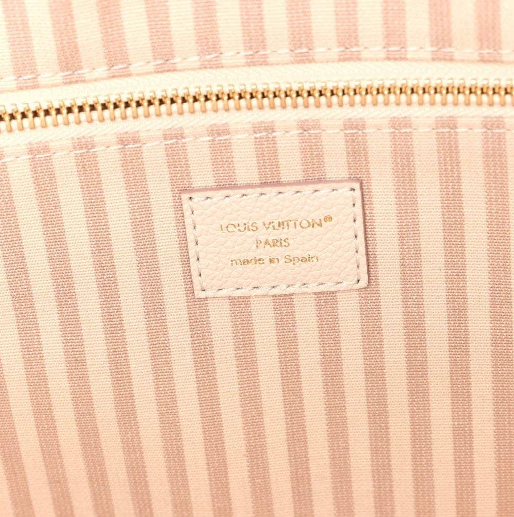 LOUIS VUITTON Monogram Debossed Neverfull MM in Eden. Deze prachtige tas is gemaakt van beige met roze ondertonen met monogram gebosteerd leer. Het heeft lederen bovenhandgrepen en gepolijste goudkleurige hardware. De bovenkant opent naar een gestreept stoffen interieur met een hangende ritszak en een afneembare pochette.